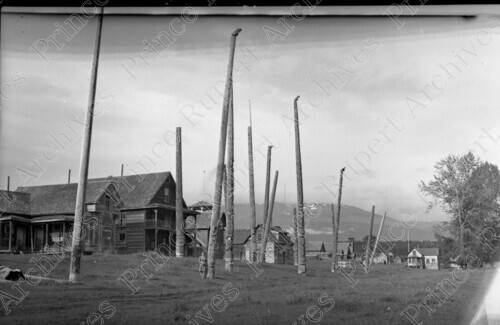 Title: Group of Fourteen Totem Poles at Kispiox, BC