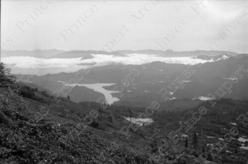 Scope & Content: Item consists of a view of Rainbow Lake from a mountain top