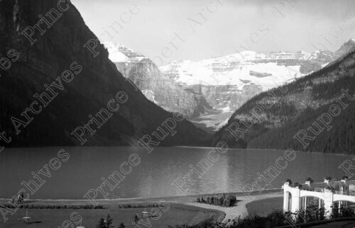 Scope & Content: Item consists of a view of Lake Louise at Banff National Park. A mountain range can be seen in the background.
