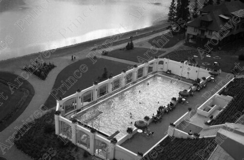 Scope & Content: Item consists of a view of a swimming pool at Lake Louise from a balcony. The lake itself can be seen on the left.