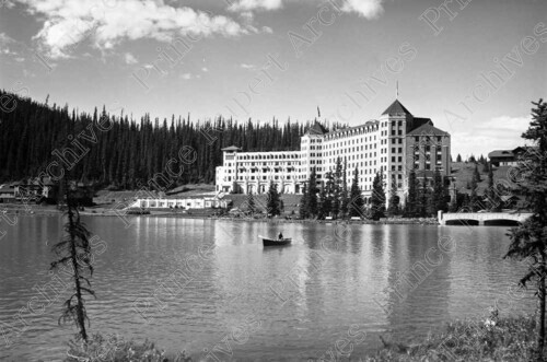 Scope & Content: Item consists of a view from the water of the Lake Louise Hotel in Banff National Park.