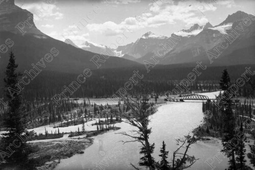 Scope & Content: Item consists of a view of the Athabasca River in Jasper National Park. A bridge can be seen running over the river and a mountain range can be seen in the background.