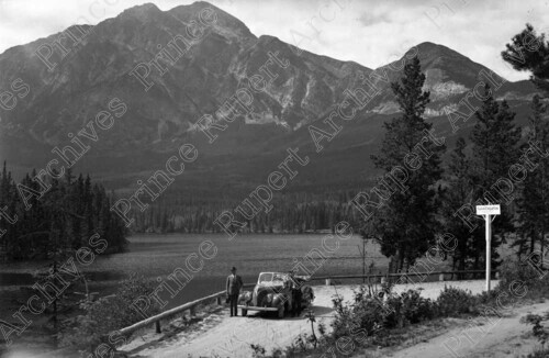 Scope & Content: Item consists of a view of Pyramid Mountain and a body of water in Jasper National Park. Two men can be seen standing near a car on the roadside.