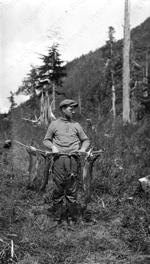 Scope & Content: Item consists of William Walker Wrathall at Khtada Lake with three trout on a stick. Handwritten annotation on recto of copy 2 reads: "W.W. Wrathall - Khatada [sic] lake. 1928." Stamped annotation on verso of copy 2 reads: "Photo by Jack Wrathall Prince Rupert, B. C."