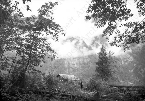 Scope & Content: Item consists of a man standing in front of a log cabin. Large snow capped mountains can be seen in the background