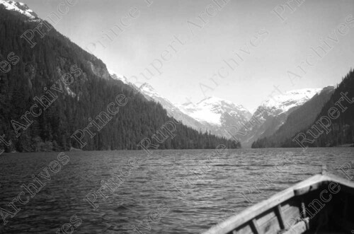 Scope & Content: Item consists of a view of Khtada Lake with the bow of a rowboat in the foreground. A mountain range can be seen in the background. Handwritten annotation on recto of copy 2 reads: "Khatada [sic] Lake. 1936." Stamped annotation on verso of copy 2 reads: "Photo by Jack Wrathall Prince Rupert, B. C."