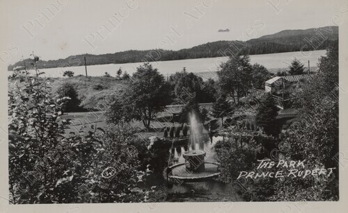 Scope & Content: Item consists of a view of CNR Park including the park's fountain. Handwritten annotation by Jack Wrathall on recto reads: "W. The Park Prince Rupert."