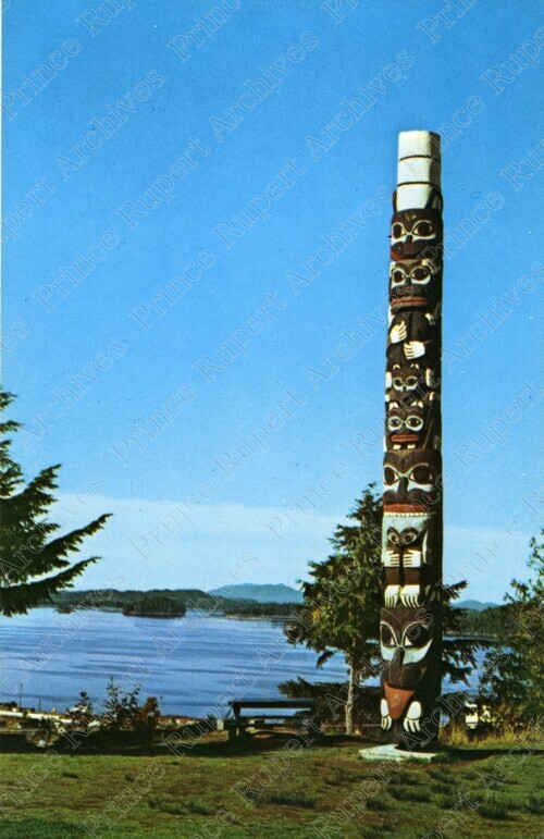 Scope & Content: Item consists of the Grizzly Bear of Yan totem pole on Roosevelt Hill. The harbour can be seen in the background and a picnic table can be seen near the totem pole. Typed annotation on verso reads: "Totem Pole situated in Roosevelt Park overlooking Prince Rupert harbour. This is the Grizzly Bear Pole of Yan and came from Yan at the west entrance to Masset Harbour in the Queen Charlotte Islands. Wrathall's Photo Finishing, P.O. Box 97, Prince Rupert, B.C. Canada."