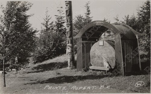 Scope & Content: Item consists of a totem pole and a large framed log at CN Park. A dog can be seen sniffing the log. Handwritten annotation on recto reads: "Prince Rupert, B.C. W."
