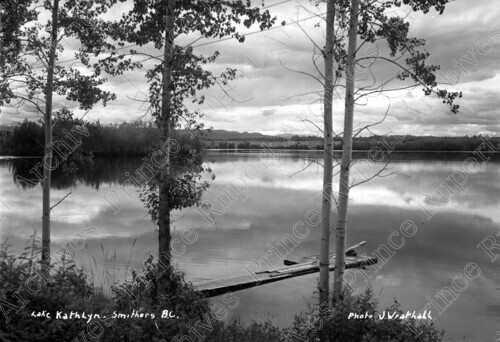 Scope & Content: Item consists of a view of Lake Kathlyn near Smithers, BC. The view includes a wharf and trees. Handwritten annotation on recto of copies 1 and 2 reads: "Lake Kathlyn, Smithers B.C. Photo J. Wrathall." Handwritten annotation on recto of copy 2 reads: "1947." Stamped annotation on verso of copy 2 reads: "Photo by Jack Wrathall Prince Rupert, B. C."