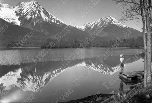 Scope & Content: Item consists of a person standing on a wharf looking at Lake Kathlyn near Smithers. The Hudson Bay Mountain can be seen in the background.