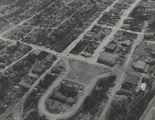 Scope & Content: Item consists of an aerial view of the east end of Prince Rupert including the Prince Rupert Courthouse on Market Place, houses and other buildings. Stamped annotation on verso reads: "Photo by Jack Wrathall Prince Rupert, B. C. NO-957. 1950."