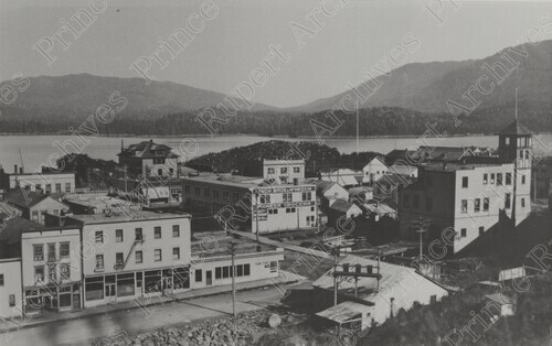 Title: Fraser Street and 5th Street Including the Savoy Hotel, Prince Rupert Club, Smith Block and Fire Hall in Prince Rupert, B.C. in 1929