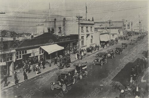Scope & Content: Item consists of a view of cars participating in a parade on the 400 and 500 block of 3rd Avenue West. The Bank of Montreal can be seen in the background. Stamped annotation on verso reads: "Photo by Jack Wrathall Prince Rupert, B. C." Handwritten annotation on verso reads: "CO - 132 Parade 400 & 500 Blks. 3rd. Ave. W. About 1920."