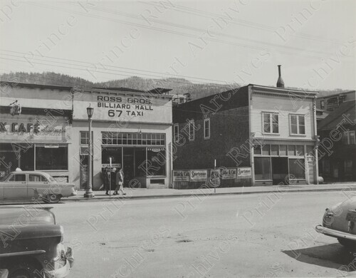 Scope & Content: Item consists of a view of the 700 block of 2nd Avenue West including Ross Bros. Taxi and Billiard Hall and the Rex Cafe. Stamped annotation on verso reads: "Photo by Jack Wrathall Prince Rupert, B. C." Handwritten annotation on verso reads: "NO-1170 1953."
