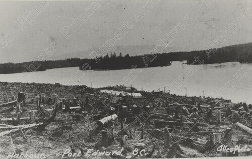 Scope & Content: Item consists of a view of tent houses in a deforested area of Port Edward. The harbour can be seen in the background. Handwritten annotation on recto reads: "Harbour Port Edward, B.C. Allen Photo." Stamped annotation on verso reads: "Photo by Jack Wrathall Prince Rupert, B. C." Handwritten annotation on verso reads: "CO-722 Clearing town site Port Edward, B.C. 1910."