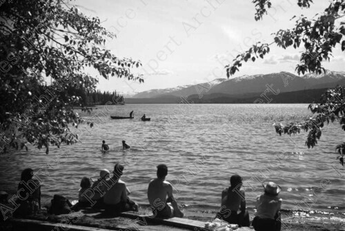 Scope & Content: Item consists of a view of Lakelse Lake. The view includes people sitting along the shore, two children in the water and two other people in rowboats. Mountains can be seen in the background. Handwritten annotation on recto of copy 2 reads: "Lakelse Lake. Terrace, B.C. 1954." Stamped annotation on verso of copy 2 reads: "Photo by Jack Wrathall Prince Rupert, B. C."