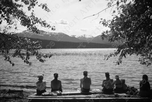 Scope & Content: Item consists of people sitting on the edge of Lakelse Lake looking out towards the water and mountains.