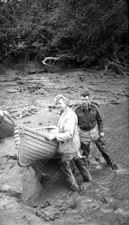 Scope & Content: Item consists of Jack Wrathall, on the left, and George Attrill, on the right, wearing hip waders and in the water with a rowboat on the shore of the Khyex River. Handwritten annotation on recto of copy 2 reads: "Khyax [sic] River. Jack Wrathall. - Geo. Attrill. 1945." Stamped annotation on verso of copy 2 reads: "Photo by Jack Wrathall Prince Rupert, B. C."