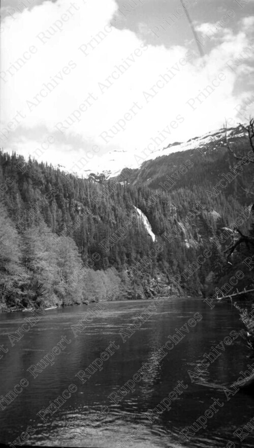 Scope & Content: Item consists of a view of the Khyex River with mountains in the background.