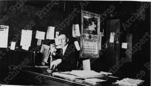 Scope & Content: Item consists of a Stanley E. Parker sitting at a desk and smoking a pipe at Pacific Cartage Ltd. on the 200 block of 3rd Avenue East. Handwritten annotation on recto reads: "S.E. (Stan) Parker. Pacific Cartage. 200 Blk. 3rd Ave. E. 1922." Stamped annotation on verso reads: "Photo by Jack Wrathall Prince Rupert, B. C."