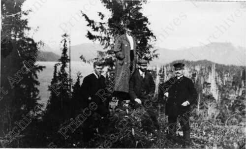Scope & Content: Item consists of a Mr. Agnew, Mr. and Mrs. McIntosh and Anglican Bishop of Caledonia Frederick Du Vernet standing on a hill. Du Vernet is pictured farthest on the right. Handwritten annotation on recto reads: "Mr Agnew. Mr. & Mrs. MackIntosh [sic] & Bishop Du Vernet. 1906 on Site of the "Prince Rupert Inn." Stamped annotation on verso reads: "Photo by Jack Wrathall Prince Rupert, B.C."