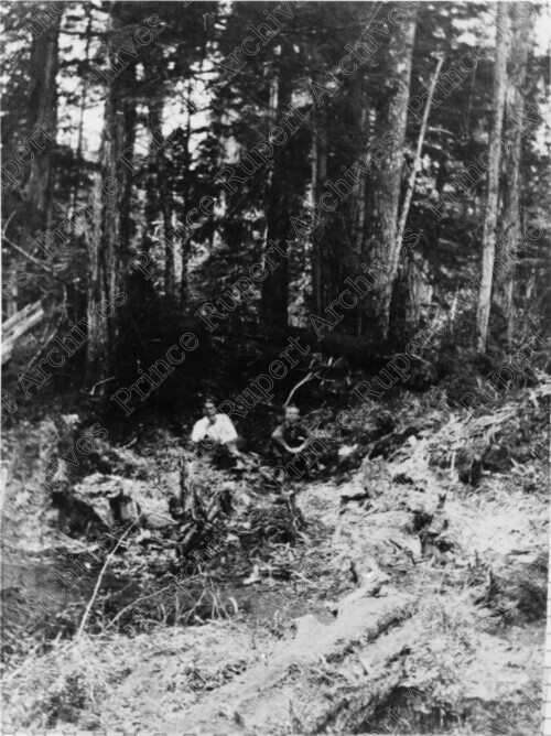 Scope & Content: Item consists of Horace Du Vernet and Leslie Longbur sitting in a forest. Handwritten annotation on recto reads: "Horace Du Vernet, Leslie Longbur. Pr. Rupert, B.C. 1906." Stamped annotation on verso reads: "Photo by Jack Wrathall Prince Rupert, B.C."