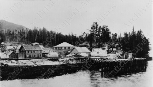 Scope & Content: Item consists of a view of the waterfront including Centre Street, buildings, tent houses and the first wharf. Handwritten annotation on recto reads: "First Part of Pr. Rupert. Centre St. Wharf & Buildings. Feb. 1907." Stamped annotation on verso reads: "Photo by Jack Wrathall Prince Rupert, B. C."