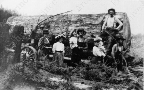 Title: Workmen, Their Wives and Children Near a Large Log in Prince Rupert, B.C. in 1907