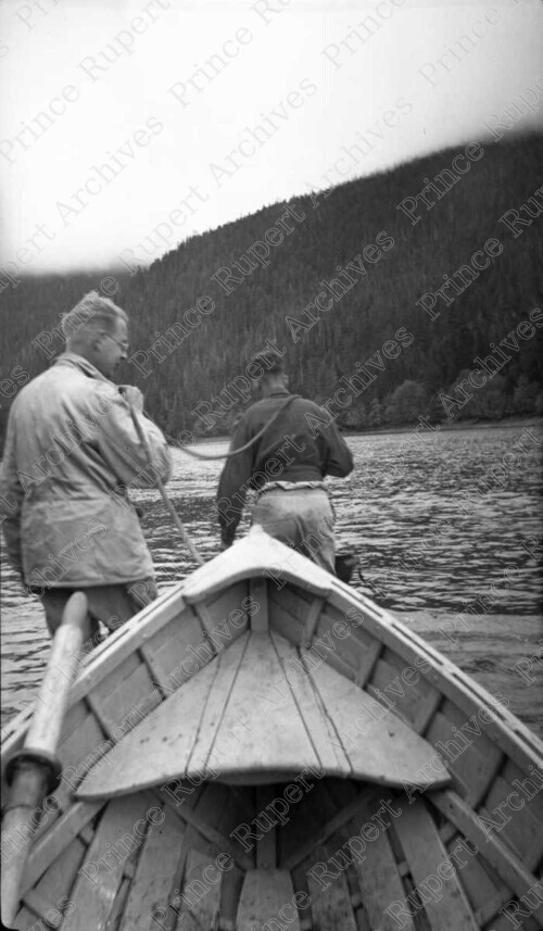 Scope & Content: Item consists of Jack Wrathall, on the left, and another man (George Attrill?) pulling a rowboat into the waters at the Khyex River.