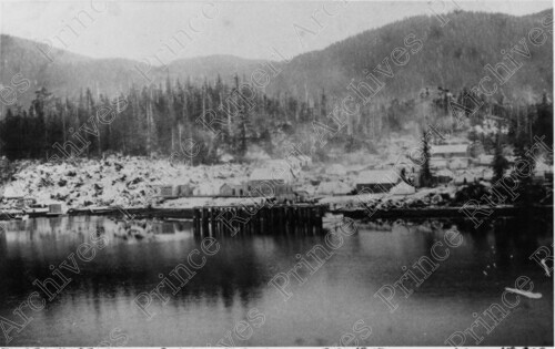 Scope & Content: Item consists of a view of the Prince Rupert waterfront including buildings, tent houses and the town's first wharf. Handwritten annotation on recto reads: "First Wharf - Tents - Buildings. Pr. Rupert, B.C. 1907." Stamped annotation on verso reads: "Photo by Jack Wrathall Prince Rupert, B. C."