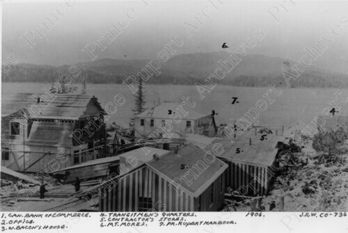 Scope & Content: Item consists of an overhead view of Avenue A. The view includes the Canadian Bank of Commerce, an office building, W. Bacon's houses, the transit men's quarters, contractors stores, Mount Morse and tent houses. Handwritten annotation on recto reads: "1. Can. Bank of Commerce, 2. Office, 3. W. Bacon's House, 4. Transitmen's Quarters, 5. Contractor's Stores, 6. Mt. Morse, 7. Pr. Rupert Harbour. 1906." Stamped annotation on verso reads: "Photo by Jack Wrathall Prince Rupert, B. C."