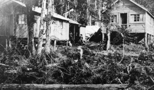 Scope & Content: Item consists of a view of a Mr. Witcomb and Mr. and Mrs. McIntosh sitting behind a house. Another house can be seen in the background on the right. Handwritten annotation on recto reads: "Mr. Witcomb, Mr. & Mrs. McIntosh. Prince Rupert. 1907." Stamped annotation on verso reads: "Photo by Jack Wrathall Prince Rupert, B. C."