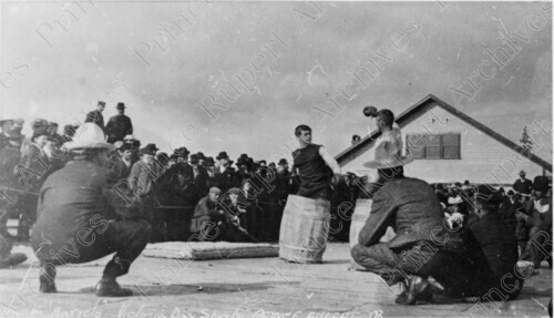 Scope & Content: Item consists of a view of two men standing in barrels boxing on the GTP Wharf as part of Victoria Day celebrations. A crowd of people can be seen watching the boxing match. Handwritten annotation on recto reads: "Boxing in Barrels. Victoria Day Sports. G.T.P. Wharf. 1908." Stamped annotation on verso reads: "Photo by Jack Wrathall Prince Rupert, B. C."