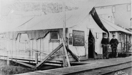 Scope & Content: Item consists of two men standing in front of a tent housing Prince Rupert's first post office on Centre Street. One of the men is distorted by an after image effect. Handwritten annotation on recto reads: "Allen Photo. First Post Office. Centre St. Pr. Rupert. 1908." Stamped annotation on verso reads: "Photo by Jack Wrathall Prince Rupert, B. C."