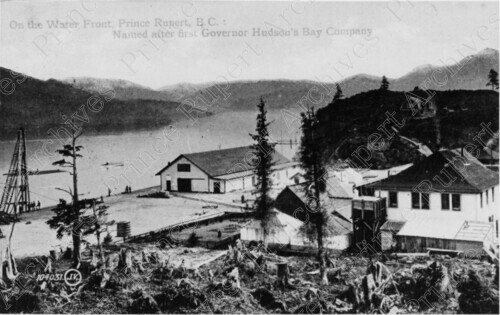 Scope & Content: Item consists of a view of the waterfront including the GTP Wharf, a freight shed and Pillsbury House. A piledriver can be seen on the left. Typed annotation on recto reads: "J.V. On the Water Front, Prince Rupert, B.C.: Named after first Governor Hudson's Bay Company." Handwritten annotation on recto reads: "G.T.P. Wharf, & Freight Shed. G.T.P. Res. House on Hill. 1908." Stamped annotation on verso reads: Photo by Jack Wrathall."