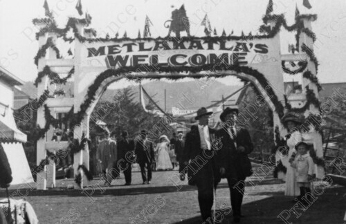 Scope & Content: Item consists of a welcome arch from the Village of Metlakatla to celebrate Canadian Prime Sir Wilfrid Laurier's visit to Prince Rupert on Centre Street. The arch reads: "Metlakatla's Welcome." Handwritten annotation on recto reads: "Centre St. Pr. Rupert. 1910." Stamped annotation on verso reads: "Photo by Jack Wrathall Prince Rupert, B. C."