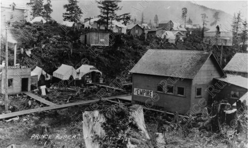 Scope & Content: Item consists of a view of Rupert Road including houses, tent houses, The Empire newspaper office, the Exchange Grill and a bakery. Handwritten annotation on recto reads: "Prince Rupert. B.C. June 26/08. JDA. Rupert Road. The Empire. & Stores. June 26. 1908." Stamped annotation on verso reads: "Photo by Jack Wrathall Prince Rupert, B. C."