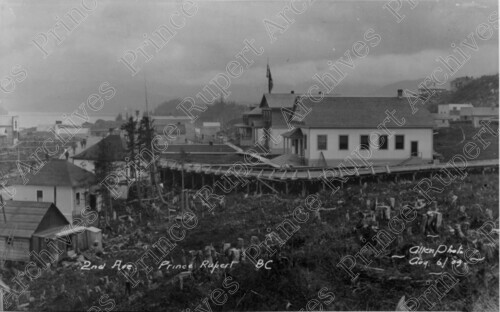 Scope & Content: Item consists of a view of 2nd Avenue and 4th Street including houses, the first Catholic Church in Prince Rupert, the courthouse and other government buildings. One of the houses belonged to Reg Clark. Handwritten annotation on recto of copies 1 and 2 reads: "2nd Ave. Prince Rupert BC. Allen Photo Aug. 6/09." Handwritten annotation on recto of copy 1 reads: "Govt. Court House Buildings. Left First Catholic Church. 2nd. Ave. & 4th St." Stamped annotation on verso of copy 1 reads: "Not to be Reproduced or Published Without Authority of Wrathall's Photo Finishing Prince Rupert, B. C. J R Wrathall." Handwritten annotation on recto of copy 2 reads: "Catholic Church. 2nd. House. Reg Clark's Govt Bldg. 2nd. Ave. & 4th St. Aug 6. 1909."