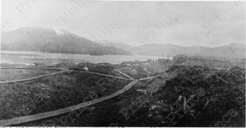 Scope & Content: Item consists of an overhead view of 1st, 2nd and 3rd Avenue, McBride Street and Market Place. The view includes houses, tent houses and wooden walkways. Mount Morse can be seen in the background. Handwritten annotation on recto reads: "1908. 1st. 2nd & 3rd Ave's [sic]. McBride St. & Market Place Pr. Rupert. B.C." Stamped annotation on verso reads: "Photo by Jack Wrathall Prince Rupert, B. C."