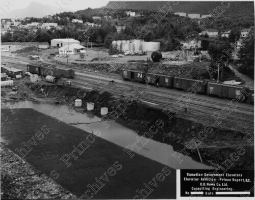 Scope & Content: Item consists of a view of the construction site for an addition to the Canadian Government Grain Elevator on the waterfront. The view includes railway cars on CN Railway tracks. Houses and other buildings can be seen in the background. Typed annotation on recto reads: "Canadian Government Elevators Elevator Addition : Prince Rupert, B.C. C.D. Howe Co. Ltd. Consulting Engineering. No. Date." Stamped annotation on verso reads: "Photo by Jack Wrathall Prince Rupert, B. C."