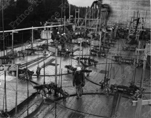 Scope & Content: Item consists of the construction site for a new addition to the Canadian Government Grain Elevator on the waterfront. Workmen wearing hard hats can be seen walking around the site. Stamped annotation on verso reads: "Photo by Jack Wrathall Prince Rupert, B. C."