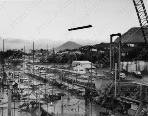 Scope & Content: Item consists of a view of the construction site for a new addition to the Canadian Government Grain Elevator on the waterfront. A workman at a cement mixer can be seen in the foreground and a crane can be seen lifting a metal beam. Stamped annotation on verso reads: "Photo by Jack Wrathall Prince Rupert, B. C."