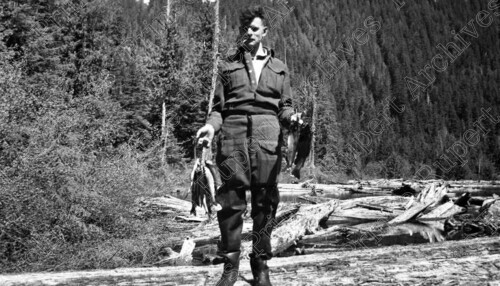 Scope & Content: Item consists of George Attrill holding a catch of fish at Khyex River.