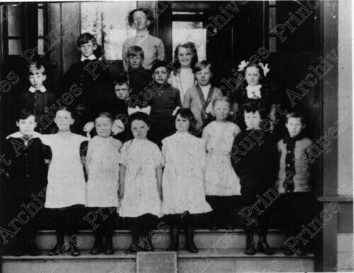 Scope & Content: Item consists of a class of students and their teacher gathered on the front steps of Seal Cove School on 8th Avenue East. Pictured in the front row from left to right is: Bobby Mathieson, Beatrice Kean, Grace Crate, May Owens, Edna Walters, a girl named Mary, Alex Sandy Duncan and Leslie Tattersall. Pictured in the middle row from left to right is: Rodger Holland, George Blyth, Reggie Kelsey, George Walsh and Ethel Smith. Pictured in the third row from left to right is: Eric Holland, Horace Tettersall and Gladys Mathieson. Pictured standing in the back is teacher Ms. Moore. A sign in front of the class reads "Prince Rupert April 8th 1914." Handwritten annotation on recto of copies 1 and 2 reads: "Seal Cove School. 1725 - 8th. Ave. E. Pr. Rupert, B.C. 1914. R.E. Benson." Stamped annotation on verso of copy 1 reads: "Photo by Jack Wrathall Prince Rupert, B. C."