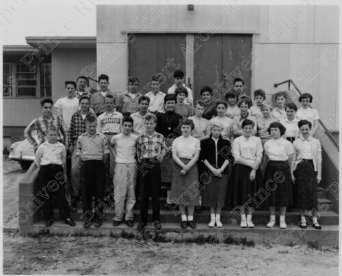 Scope & Content: Item consists of a view of a Booth Memorial School class gathered on the School's steps on 6th Avenue East and Hays Cove Circle. Stamped annotation on verso reads: "Photo by Jack Wrathall Prince Rupert, B. C. 1957."