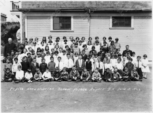 Scope & Content: Item consists of two priests and a school staff member standing next to a large group of students at Annunciation Catholic School. Handwritten annotation on recto reads: "Pupils Annunciation School Prince Rupert BC June 18, 1926." Stamped annotation on verso reads: "Photo by Jack Wrathall Prince Rupert, B. C."