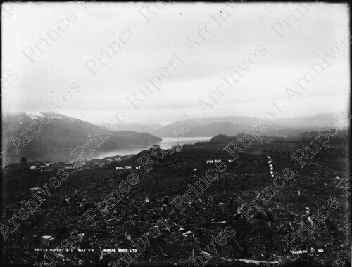 Scope & Content: Item consists of a view of Houses, other buildings, wooden roads, Fulton Street and 6th Avenue West. Mount Morse can be seen in the background on the left. Handwritten annotation on recto reads: "Fulton St, 6th Ave. Prince Rupert B C May 08 McRae Bros Ltd. Section No." Stamped annotation on verso reads: "Photo by Jack Wrathall Prince Rupert, B. C."