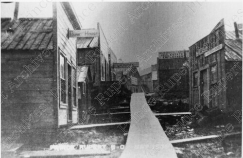 Scope & Content: Item consists of a view of a street lined with businesses. A bunk house can be seen on the left and a real estate office can be seen on the right. Handwritten annotation on recto reads: "St. Prince Rupert 1908." Stamped annotation on verso reads: "Photo by Jack Wrathall Prince Rupert, B. C."