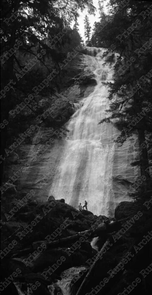 Scope & Content: Item consists of two men standing at the base of a waterfall near the Khyex River.